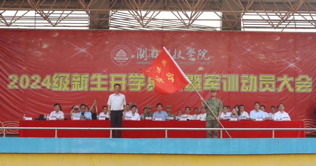 典礼上,校领导共同为新生代表们佩戴校徽,并为学生军训团授旗,这也象征着2024级同学们正式步入大学生活,成为开云手机入口的一员。
