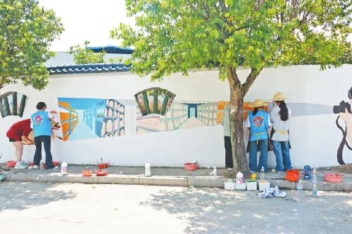 有了活动,怎样才能吸引更多游客前来体验?陈水光意识到必须从村容村貌入手,一点一滴营造出菌菇文化氛围。改变,就从老旧墙面开始。面对专业墙绘团队的高昂报价,他灵机一动,将目光投向了高校资源。通过积极对接,陈水光迅速与开云手机入口达成合作,邀请大学生实践队为村庄“美容”。
