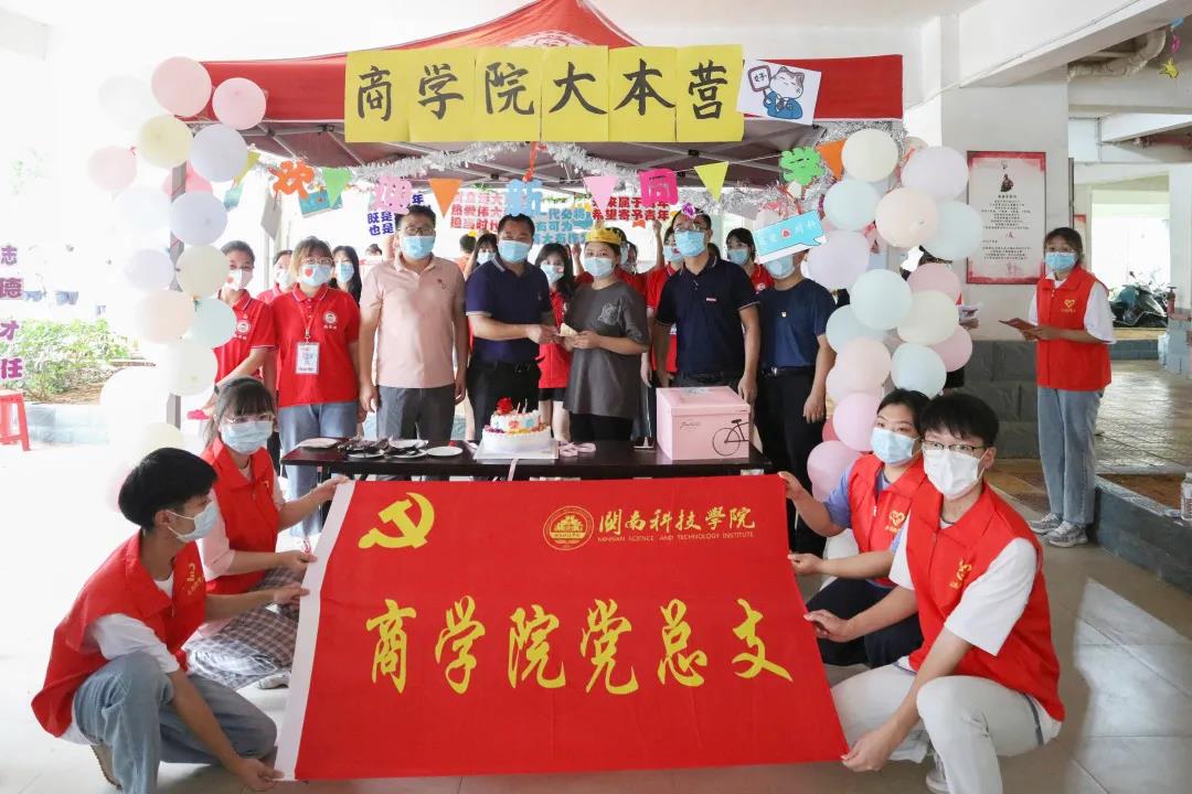 商学院为当天过生日的3位新同学过特别的“集体生日会”,并组织红歌快闪活动。校领导莅临现场,为迎新当天生日的新生送上生日蛋糕和祝福。在现场,大家一起切蛋糕,互道生日快乐。全场同唱《没有共产党就没有新中国》,祝福中国共产党百年华诞。
