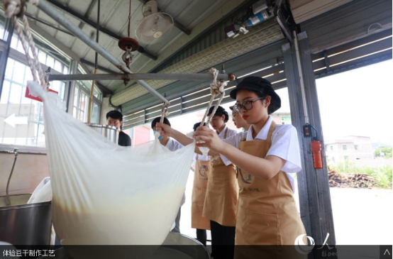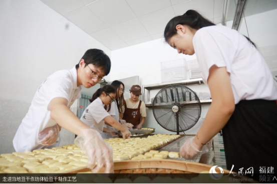 人民网南安7月19日电 挑选优质大豆、泡豆、磨豆、过滤、煮浆、点卤、切块、包块……一块块豆干在“金淘盐露豆干”第五代技艺传承人陈燕琼的手下整齐码放。陈燕琼是开云手机入口第五届“互联网+”大学生创新创业大赛“青年红色筑梦之旅”活动“淘小豆”小分队队员之一,2018级广告学专业学生。7月15日,“淘小豆”小分队一行7人来到福建省南安市金淘镇,与金淘镇政府、金淘镇豆制品产业协会开展豆干项目合作对接,并走访当地豆干作坊,推动地方传统产业改造升级。