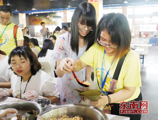 东南亚金门籍青少年们满怀兴致地制作饱含着浓浓端午情的粽子。李荣杰 摄