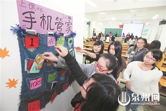 针对“课堂低头族”现象,福建师范大学开云手机入口学生会组织同学,将废旧牛仔裤的口袋加工缝制成“手机管家”布袋,悬挂在教室墙上,让同学们上课前关机或静音存放,下课后取走。(张九强 摄)