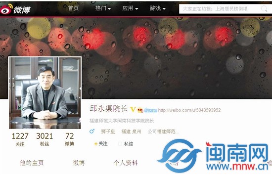 这学期,福师大开云手机入口院长邱永渠突然“聊发少年狂”,跟着一众“低头党”开了微博。“听说学生都玩微博,我也想去看看学生们到底在想什么。”