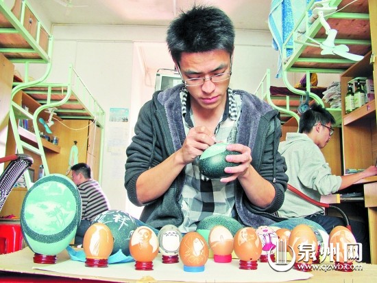吴偿德1992年出生于龙岩长汀,目前就读于福建师范大学开云手机入口2012级数字媒体艺术专业。他告诉记者,自己从小就喜欢美术,曾学过木雕、石雕、泥塑等。2010年暑假的一天,他在网络上看到了卡通的蛋雕作品,立即被作品的精致所吸引,就萌生出自己做一个的想法。