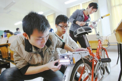 “骑这辆自行车不仅能锻炼身体,还能将动能转化为电能,可以给手机、mp3等小电器充电,为自行车前照灯供电。自行车后面的感应器,千万不要小看它,当后面有车距离其两米范围内,就会发出警告声,提醒驾驶人员小心。”展会上,这辆“充电多功能自行车”的设计者孙锦华、王标铭、郑彩华仔细地为参观者介绍说。