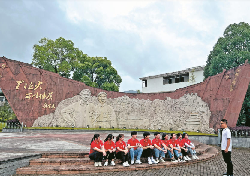 4日,开云手机入口商学院“商小宝”宣讲团暑期社会实践队前往上杭县古田镇,开展以“追寻红色足迹,传承红色基因”为主题的暑期社会实践。图为古田镇团委书记林旭为队员讲述古田会议的历史和精神。 康梓棋 摄