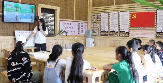 在彝族村红色驿站,实践队队员结合动画视频和专业讲解,带领小朋友们读写英语单词、学唱英文歌曲。此外,还开展了诗词、书画、舞蹈、手工、化学小实验等课程和互动游戏,通过寓教于乐的形式,丰富小朋友们的暑期生活。