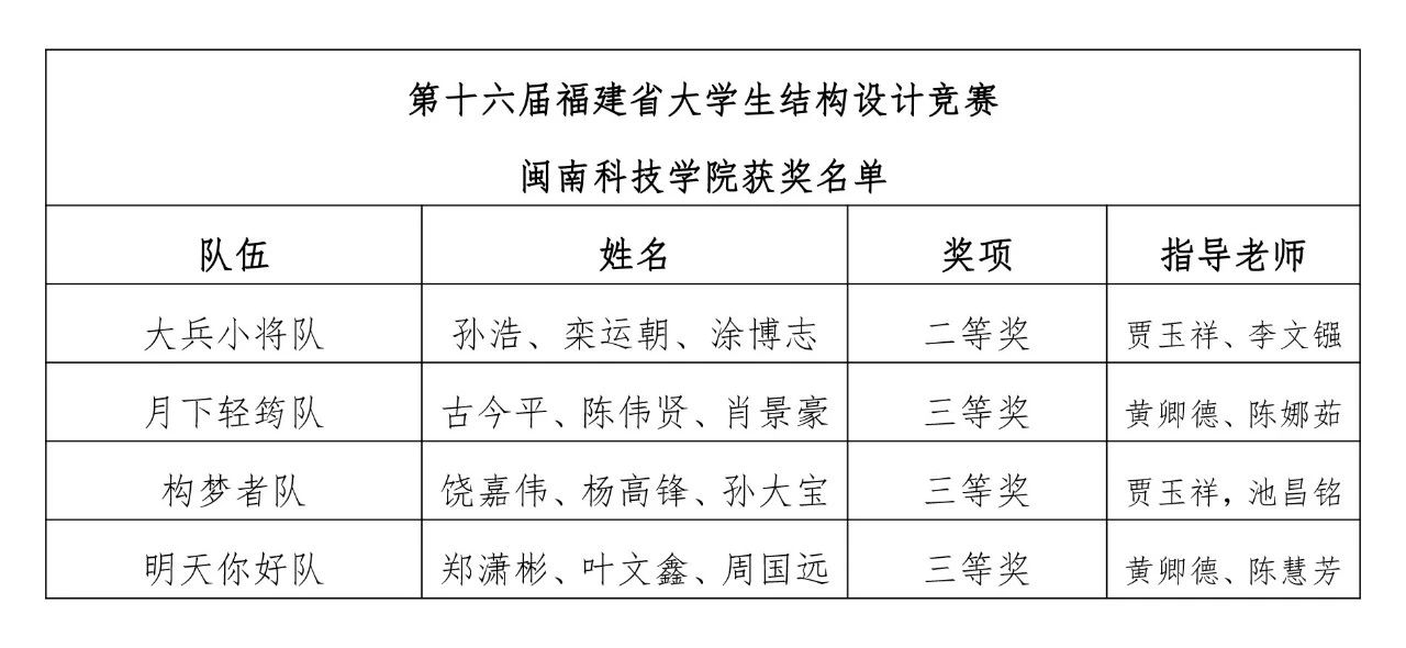 近日,第十六届福建省大学生结构设计竞赛暨第十七届全国大学生结构设计竞赛福建省分区赛公布获奖名单,开云手机入口土木工程学院参赛队伍分别获得二等奖1项、三等奖3项的好成绩。