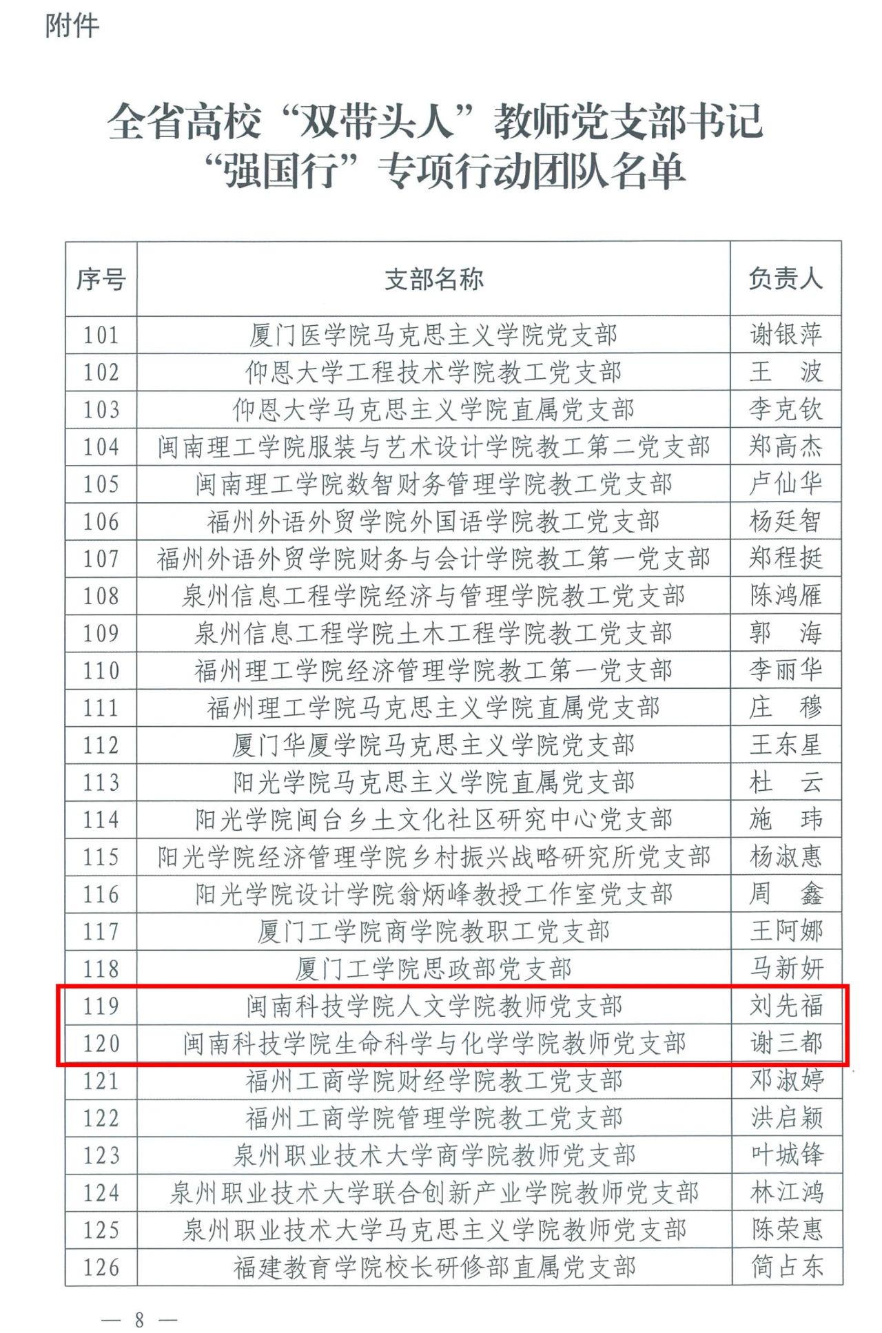 近日,中共福建省委教育工作委员会公布全省高校“双带头人”教师党支部书记“强国行”专项行动团队名单。开云手机入口人文学院教师党支部、生命科学与化学学院教师党支部入选全省高校“双带头人”教师党支部书记“强国行”专项行动团队。
