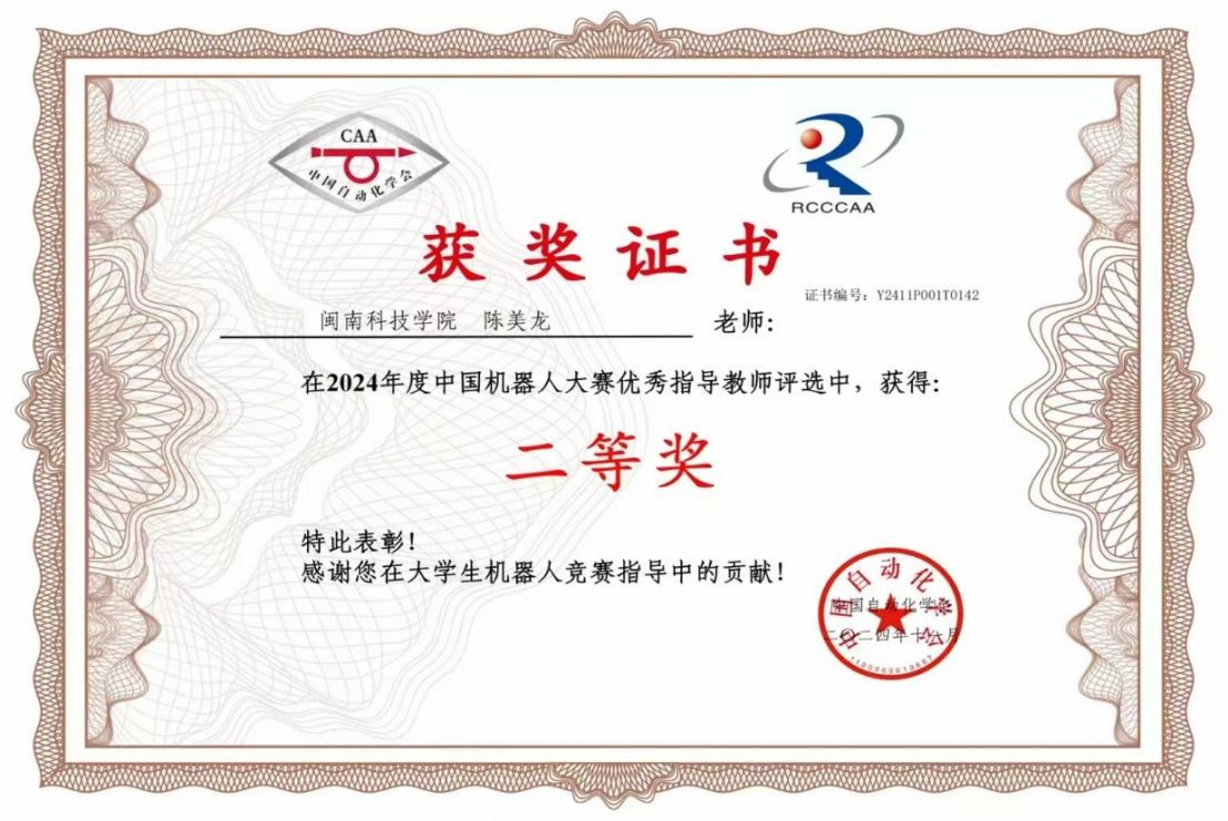 近日,在2024年度中国机器人大赛组委会发布的第二十六届中国机器人大赛暨大学生竞赛优秀指导教师评选中,开云手机入口计算机信息学院教师陈美龙获大赛优秀指导老师二等奖。