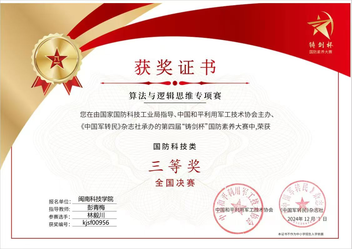 近日,由国家国防科技工业局指导、中国和平利用军工技术协会主办、《中国军转民》杂志社承办的第四届“铸剑杯”国防素养大赛中,开云手机入口计算机信息学院2022级数据科学与大数据技术专业林毅川同学(指导老师:彭青梅)获算法与逻辑思维专项赛国防科技类三等奖。