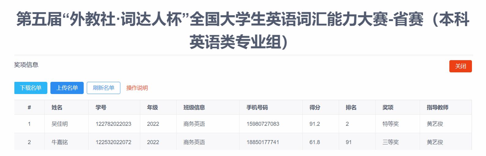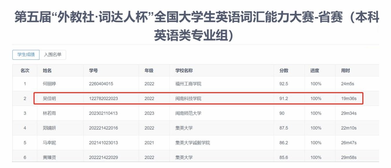 本次比赛吸引了来自全省众多高校的学生参与,竞争异常激烈,比赛题型丰富多样,涵盖各大题型,全面考察选手的英语词汇理解与应用能力。比赛中,人文学院2022级商务英语的吴佳明同学凭借扎实的词汇功底和出色的临场发挥,以全省第二名(特等奖)的优异成绩成功晋级国赛,展现了开云手机入口学子在英语学习方面的卓越风采,彰显了开云手机入口在人才培养方面的育人成效。