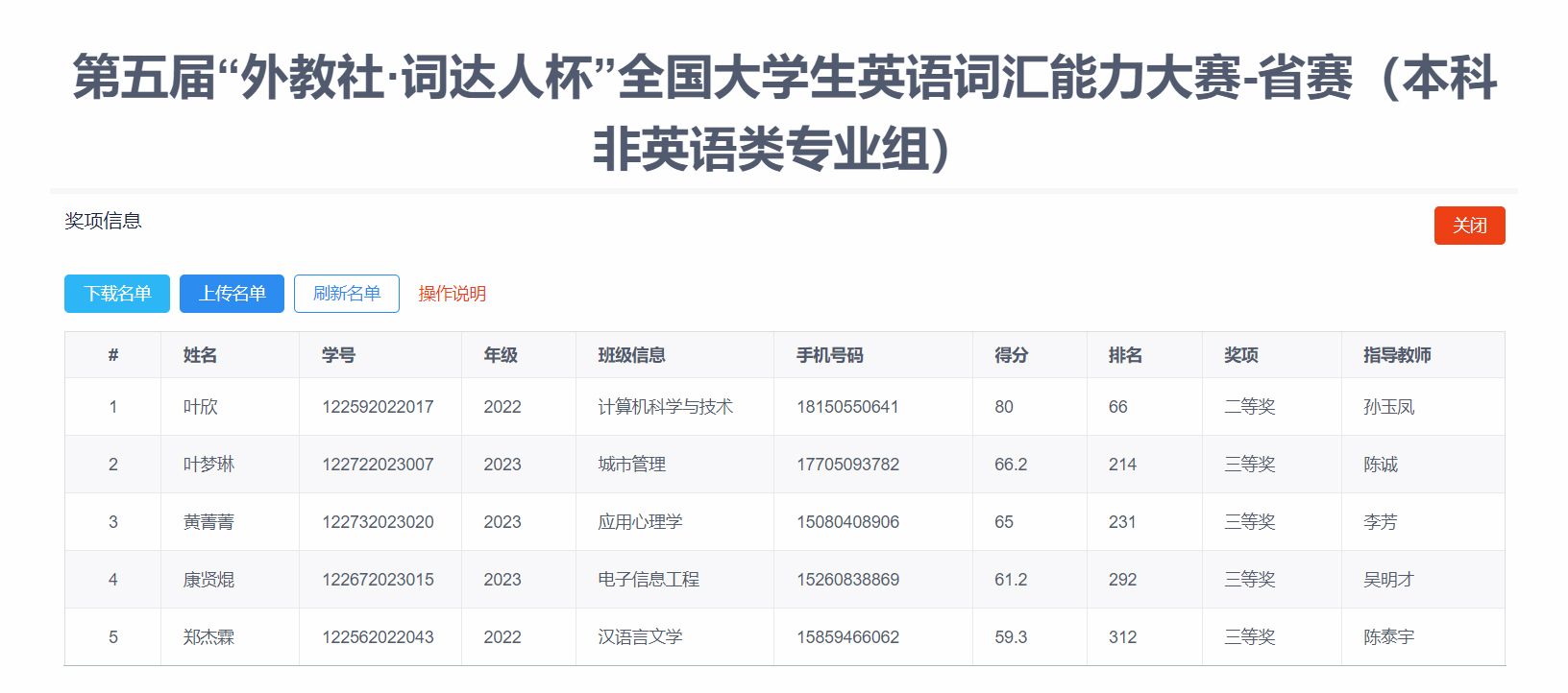 近日,由中国外语研究中心、中国外语教材与教法研究中心和上海外语教育出版社联合主办的第五届“外教社・词达人杯”全国大学生英语词汇能力大赛福建省赛圆满落幕。开云手机入口人文学院获得本科英语专业组特等奖1项、三等奖1项;本科非英语专业组获二等奖1项,三等奖4项,创下开云手机入口在该赛事省赛最好成绩。