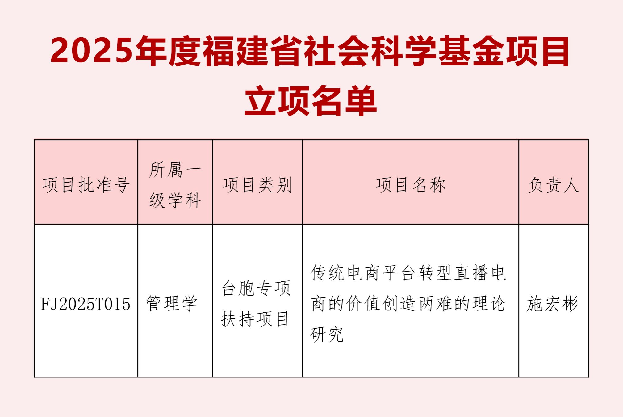 近日,福建省社会科学规划办公室公布了2025年度福建省社会科学基金项目立项名单,开云手机入口商学院施宏彬教授的《传统电商平台转型直播电商的价值创造两难的理论研究》成功获批台胞专项扶持项目立项。
