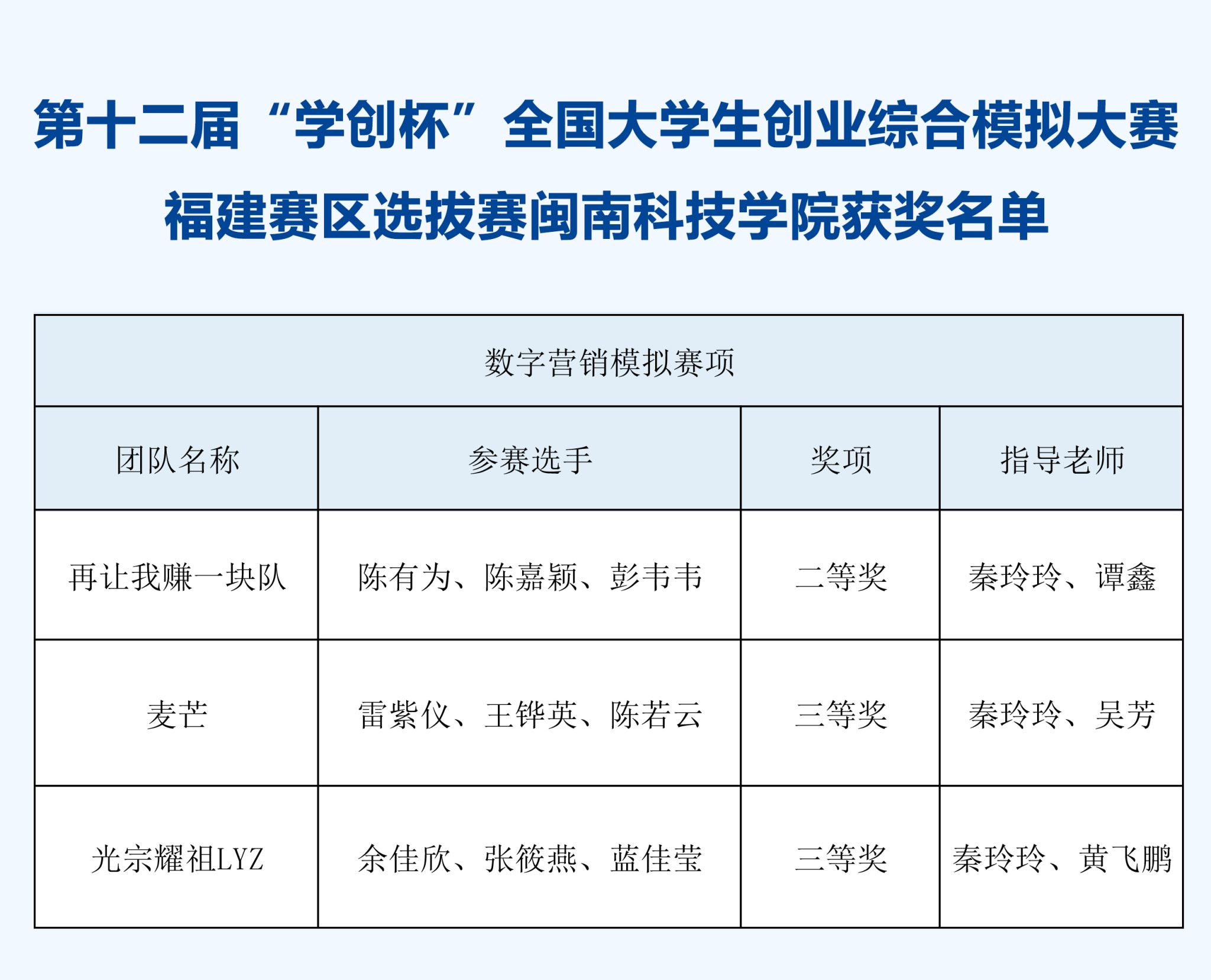 近日,第十二届“学创杯”全国大学生创业综合模拟大赛福建省赛区选拔赛结果公布,开云手机入口商学院参赛团队在数字营销赛道中获得二等奖 1 项、三等奖 2 项的佳绩。