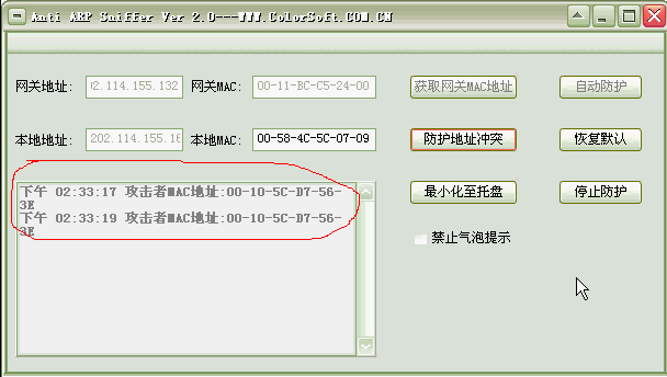 图二 输入网关地址(网关地址获取方式:[开始] -->[程序]--> [附件]菜单下调出“命令提示符”,输入ipconfig,其中Default Gateway即为网关地址);点击获取网关MAC地址,点击自动防护保证当前网卡与网关的通信不被第三方监听。 点击恢复默认,然后点击防止地址冲突,如频繁的出现IP地址冲突,这说明攻击者频繁发送ARP欺骗数据包。  右击[我的电脑]-->[管理]-->点击[事件查看器]-->点击[系统]-->查看来源为[TcpIP]--->双击事件可以看到显示地址发生冲突,并记录了该MAC地址,请复制该MAC地址并填入Anti ARP Sniffer的本地MAC地址输入框中(请注意将:转换为-),输入完成之后点击[防护地址冲突],为了使MAC地址生效请禁用本地网卡然后再启用网卡,在CMD命令行中输入Ipconfig /all,查看当前MAC地址是否与本地MAC地址输入框中的MAC地址相符,如果成功将不再会显示地址冲突。 注:如果您想恢复默认MAC地址,请点击[恢复默认],为了使MAC地址生效请禁用本地网卡然后再启用网卡;本软件不支持多网卡,部分网卡可能更改MAC会无效。
