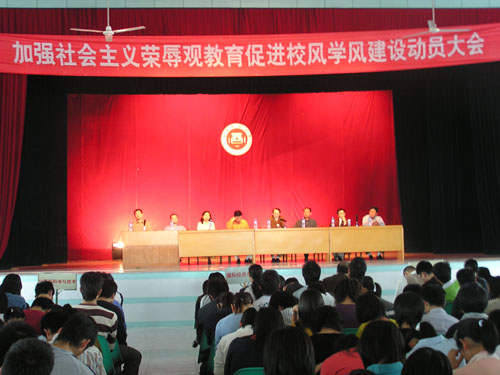 为与党中央路线保持一致,4月19日,学院召开加强社会主义荣辱观教育促进校风学风建设动员大会,院领导、学院法人代表戴宽南先生及全院师生参加了大会。黄国盛院长在会上作了关于“八荣八耻”和校风学风建设的报告。戴宽南先生代表董事会在会上发表关于荣辱观教育及校园建设情况的讲话,宣布了2006年下半年开云手机入口将隆重举行5周年校庆。最后,戴宽南先生希望同学们努力学习,将来成为社会主义建设有用的人才。黄国盛院长的报告及戴宽南先生的讲话使师生们受到深刻的教育和极大的鼓舞。