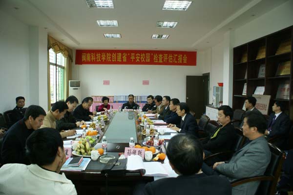 3日下午,汇报会在学院第一会议室举行。省教育工委副书记刘剑津、省学校安全工作领导小组办公室主任黄文炳、省公安厅治安总队经济文化保卫队队长楚光、福建师范大学保卫处秘书应贵勇、福建理工学校保卫科科长林品康等检查组成员。同时,泉州市教育工委副书记王瑞钦、泉州市教育局副局长孙银聪、泉州市公安局国保大队政委林集星、泉州市公安局国保大队大队长蒋图腾、南安市公安局国保大队大队长张安娜、南安市公安局康美派出所所长陈志彬等地方相关部门领导以及学院党政领导和职能部门负责人出席了汇报会。院长黄国盛教授代表董事会、学院党政领导致欢迎词,并从我院“平安校园”创建工作的基本概况、取得成效、主要举措及今后的工作方向等四个方面汇报了平安校园创建工作。汇报会后,评估评估检查组分成两组,分别召开教师座谈会和学生座谈会,了解我院平安校园建设的状况。老师和同学们都认真地结合我院自身的工作实际,积极踊跃地回答评估检查组的提问和交流我院平安校园工作的建议和体会。