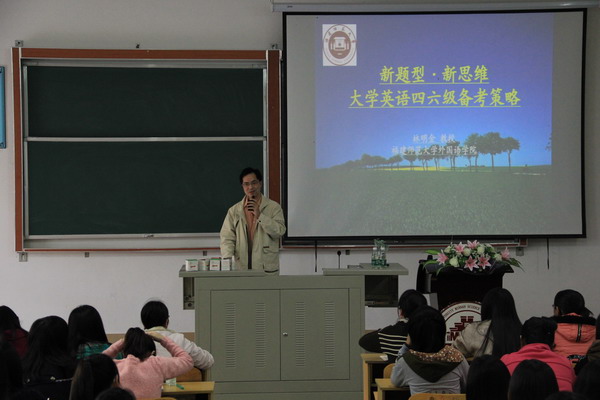 11月21日,“开云(中国)”邀请福建师范大学外语教学部主任林明金教授在菲华教学楼c#102作了题为“新题型·新思维—大学英语四六级备考策略”的讲座。讲座由我院外语系常务副主任孙文缘主持。