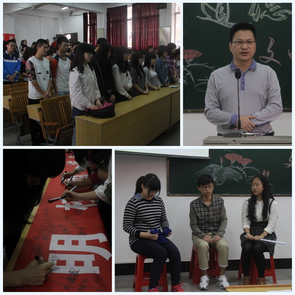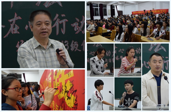 16日,2013级工商管理专业举办以“智出自立,傲然屹立”为主题举办首场道德讲堂活动,围绕“自立自强”主题,分“听一首歌曲”、“颂一段诗歌”、“看一部短片”、“讲一个故事”、“谈一些感受”、“做一个游戏”六个环节展开。在“讲一个故事”环节中,该专业的张超同学讲述亲历的自强励志故事,他从做家教赚、当服务生到组织在校生为南安车展提供全方位的服务,从而赚到第一桶金,如今他已经实现自己解决学费和生活费的诺言。他有一个创办一所中小学课外辅导机构的梦想,这个梦想雏形已定,他正在向着这个梦想而大步迈进。随后,广大师生同学起立就“自立自强自信”这一品质抒发了感想。邱永渠院长受邀参加活动,并在总结发言中向大家诠释了自强自立的中华传统美德,他希望广大师生通过道德讲堂活动,引导学生们用一颗自立的心去生活,用实际行动去回报他人和社会,做一个有自强自立的人,营造文明和谐的社会新风。