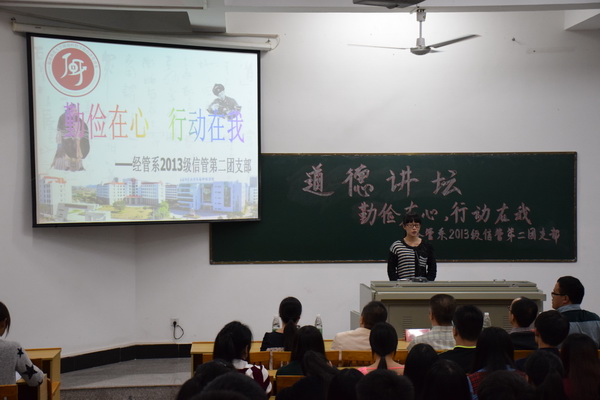 23日晚,2013级信息管理与信息系统专业“勤俭在心,行动在我”主题道德讲堂活动举行,活动围绕“唱一首歌曲”、“观一部短片”、“诵一首诗歌”、“听一个故事”、“讲一些感受”、“送一份吉祥”、“做一个承诺”七大环节展开。在“讲一些感受”环节中,同学们纷纷上台分享了自己身边勤俭节约的故事,经济管理系副主任陈晓川老师为在场师生讲述了生活处处皆勤俭,勤俭节约是一种言传身教,是一种务实的态度,其精彩演讲受到师生们欢迎。党委常务副书记林明旭受邀参加活动,他说,“勤俭在心,行动在我”道德讲堂是践行社会主义核心价值观的活动,意义重大。他希望广大师生要把内心的感动转化为践行道德的实际行动,努力成为弘扬传统美德的使者。