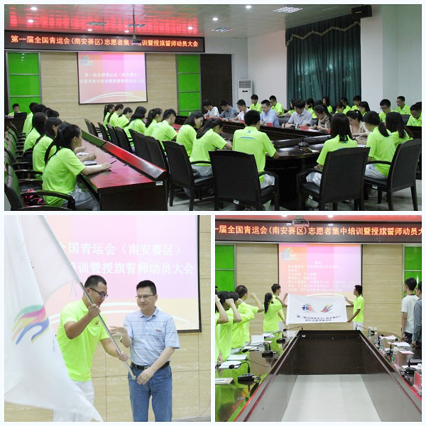 10月12日,首届全国青运会(南安赛区)志愿者授旗誓师动员大会在我院召开。南安团市委书记傅清霖、南安团市委书记助理林锦铌,院党委副书记李彬源,以及100多名志愿者参加大会。