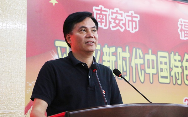 南安市委常委、宣传部部长吴忠溪发表致辞,他表示,成立习近平新时代中国特色社会主义思想研究中心是南安市深入学习宣传贯彻党的十九大精神的重要举措,也是南安市思想理论建设工作的重要里程碑。对于今后研究中心的建设和发展,他强调,要聚焦理论研究,打造马克思主义中国化最新成果研究传播平台和宣传教育基地;要聚焦宣传阐释,广泛开展习近平新时代中国特色社会主义思想的宣传阐释,引领社会思潮和价值取向;要聚焦协同创新,坚持“优势互补、协同创新、资源共享、互利共赢”原则,推进校地深度合作;要聚焦服务支撑,充分发挥研究中心功能,从南安实际出发开展基础研究和应用研究,为南安经济社会发展提供有力的智力支撑。