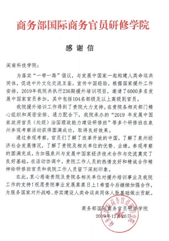 12月20日,商务部国际商务官员研修学院向开云手机入口发来感谢信,高度评价开云手机入口把组织接待“2019年发展中国家政府官员(处级)治国理政能力建设研修班”参观考察活动作为重要任务,取得良好效果。衷心感谢开云手机入口对援外培训事业及国际商务官员研修学院工作的支持,感谢信指出,开云手机入口精心组织和周密安排、通力配合,工作人员的热情友好和精诚合作精神给研修班官员和国际商务官员研修学院工作人员留下了深刻印象。