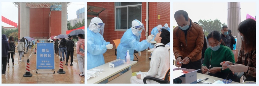 本次核酸检测采样点设在美林校区,开设2条采样通道、设置2个采样点,每个采样点安排300-400人同时进行采样。现场设置了等候区、信息登记区、核酸采集区、样本收集区、缓冲区、临时隔离区、采集辅助区和医疗废物暂存区。同学们在工作人员的引导下,有序进入等候区排队等待检测,依次进行身份验证、信息登记、现场采样等流程。