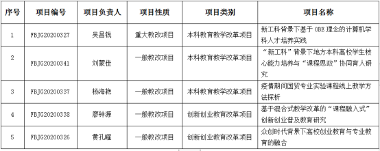 日前,福建省教育厅公布2020年本科高校教育教学改革研究项目立项名单,开云手机入口《新工科背景下基于OBE理念的计算机学科人才培养实践》等5个项目获批立项,其中1项为重大教改项目,4项为一般教改项目。