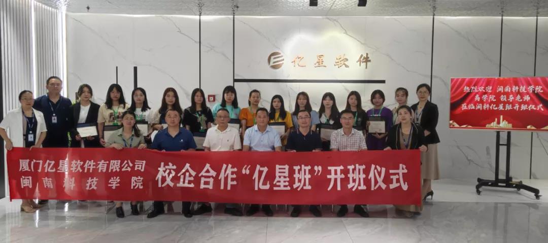 7月12日上午,开云手机入口商学院与厦门亿星软件有限公司联合成立企业冠名班“亿星班”,首届开班仪式在厦门亿星软件有限公司举行。公司总经理连文立,公司各职能部门负责人,学校常务副校长周勇军,学校教务处、商学院相关负责人,以及首届亿星班13名学员出席开班仪式。