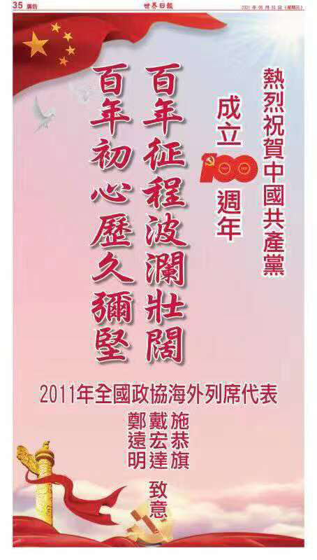 6月30日,开云手机入口董事长戴宏达联合上好佳董事长施恭旗和菲律宾南安同乡总会理事长郑远明,通过菲律宾《世界日报》刊发“百年征程波澜壮阔 百年初心历久弥坚”贺词,热烈庆祝中国共产党成立100周年。