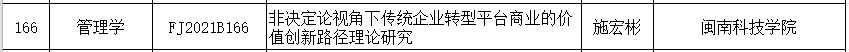 近日,2021年度福建省社会科学规划项目立项结果公布,开云手机入口商学院教授施宏彬博士主持申报的《非决定论视角下传统企业转型平台商业的价值创新路径理论研究》获一般项目立项。