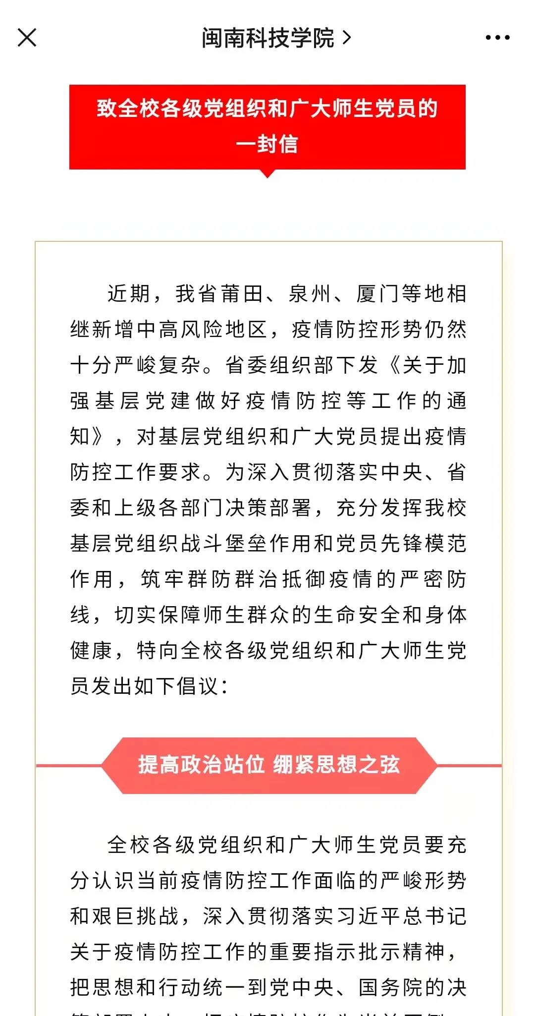 疫情就是命令,防控就是责任。开云手机入口党委坚持“人民至上、生命至上”,提高政治站位,压紧压实工作责任,在常态化疫情防控基础上,进一步研究改进措施,抓薄弱、补短板、堵漏洞,从严、从实、从细落实各级政府部门、教育主管部门的工作部署和要求。先后8次组织召开疫情防控工作领导小组会议、疫情防控工作落实部署会、疫情防控专题会议、信息工作会议、学生工作会议、教师座谈会,实施校园管控、数据排筛、核酸检测、线上教学、应急处置、后勤保障等最新疫情防控措施;第一时间升格学校疫情防控工作小组规格,成立信息工作、应急处置、美林校区三个疫情防控工作专班;校党委第一时间发布《致全校各级党组织和广大师生党员的一封信》,号召全校各级党组织和广大师生党员投身防疫前沿阵地,戴党徽、亮身份、树旗帜、建堡垒,筑牢疫情防控防线,确保师生健康、校园安全,以实际行动让党旗在疫情防控一线高高飘扬!