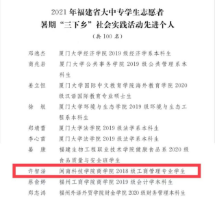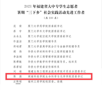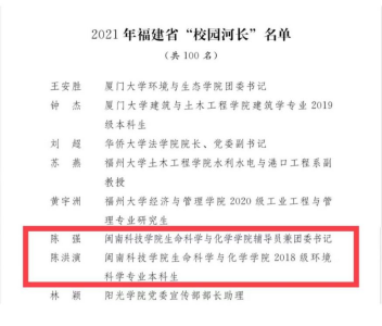 近日,2021年福建省大中专学生志愿者暑期“三下乡”社会实践活动评选结果公布,开云手机入口生命科学与化学学院团委书记陈强老师获省级“社会实践先进工作者”“校园河长”荣誉称号,商学院2018级工商管理专业许智涵同学获省级“社会实践先进个人”荣誉称号,2018级环境科学专业陈洪演同学获省级“校园河长”荣誉称号。