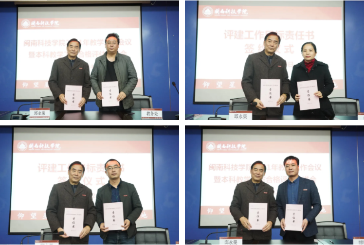 会上,还现场举行了《本科教学工作合格评估目标责任书》签订仪式,校领导分别与各行政部门负责人、二级学院院长签订评建工作责任书。