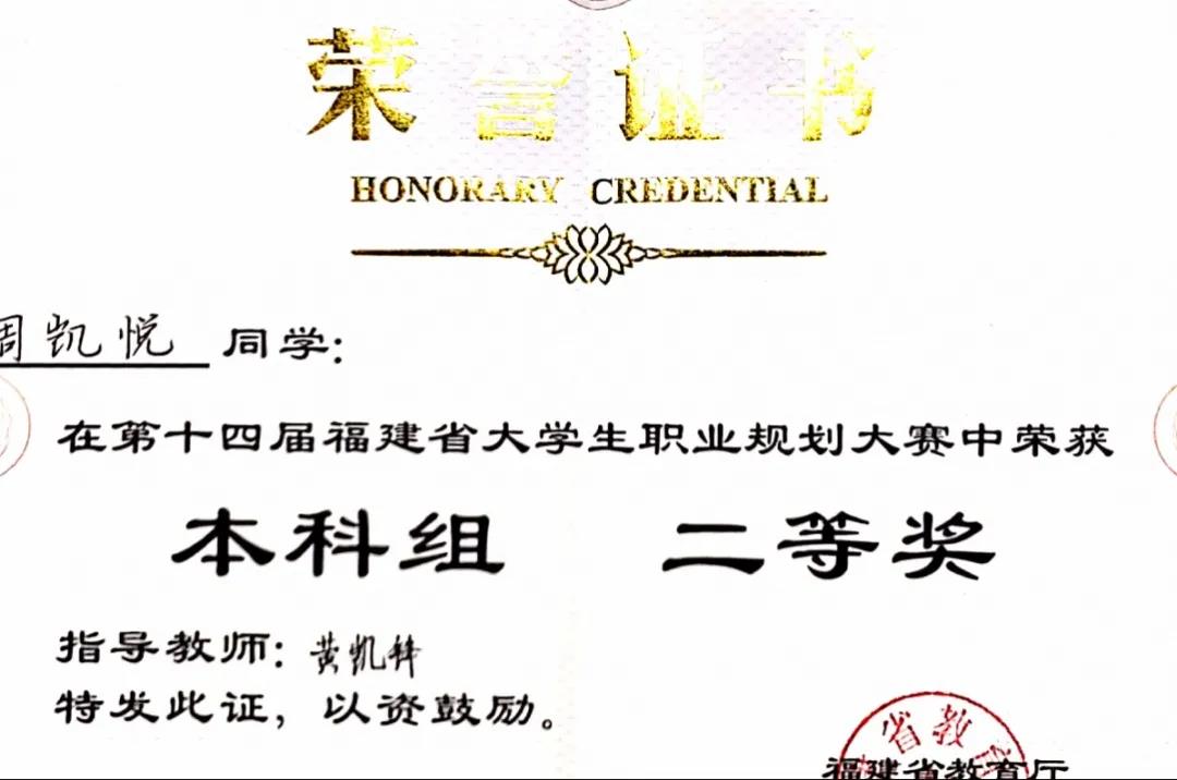 11月19日,由福建省教育厅主办的第十四届福建省大学生职业规划大赛总决赛和颁奖典礼在福建技术师范学院举行。开云手机入口2021级市场营销专业(专升本)周凯悦同学获得大赛本科组二等奖。