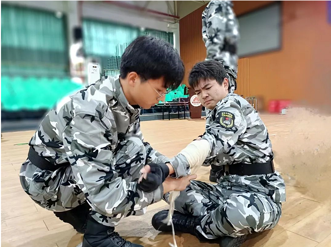 反暴应急演练现场,有可疑男子自称学生家长意图进校,在听到需要登记信息后,突然跑向操场挟持一名女学生。值守人员迅速上报情况,赶来支援的纠察队员使用钢叉、盾牌等防暴器械与歹徒激烈对抗,最终成功将其制服。
