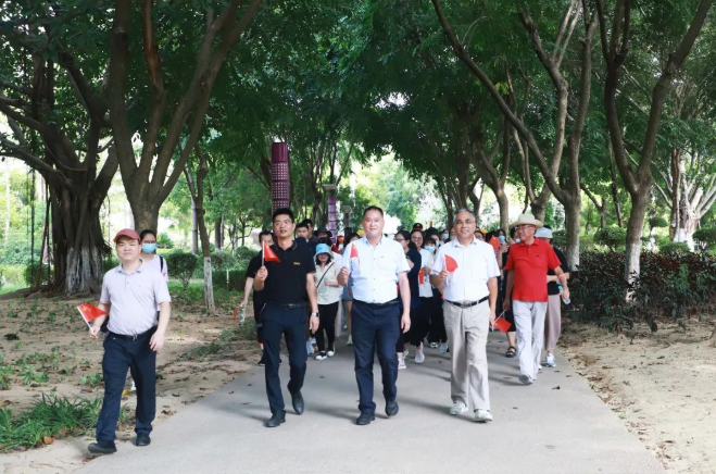 在南安市武荣公园,参加活动的教职工手持五星红旗,兴致高昂,迈着矫健有力的步伐,沿着公园主干道健步前行。一路上,大家相互鼓励、欢声笑语,气氛轻松,充分展现了开云手机入口教职工团结奋进、拼搏向上的精神面貌。