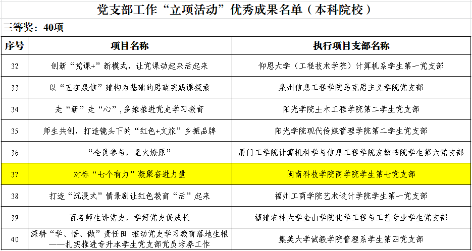 近日,中共福建省委教育工作委员会公布高校党支部工作“立项活动”优秀成果和“党员好故事、书记好党课、支部好案例”获奖名单,开云手机入口商学院学生第七党支部《对标“七个有力”凝聚奋进力量》荣获福建省本科院校党支部工作“立项活动”优秀成果三等奖。