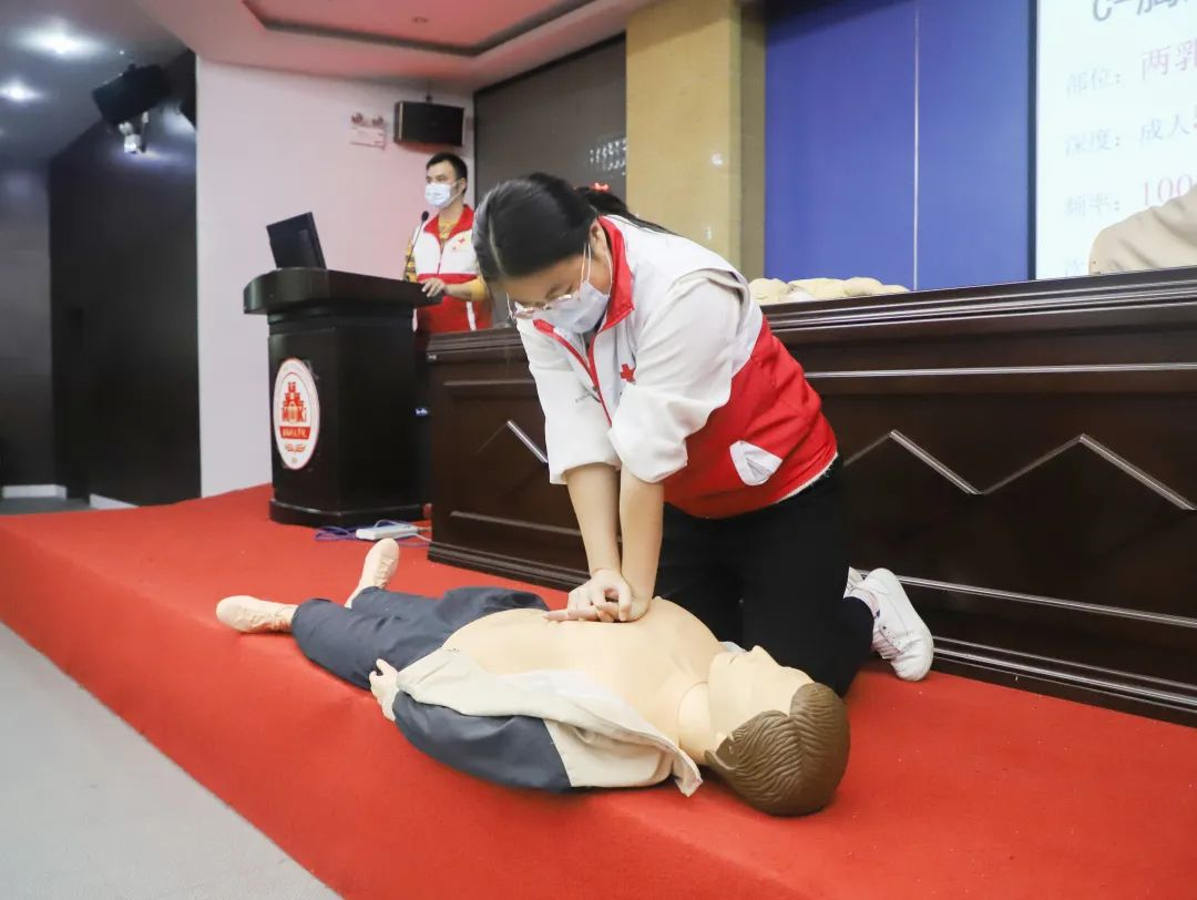 培训会上,南安市红十字应急救护培训中心老师们采用理论讲解和实操演示相结合的方式,借助PPT课件为学员们讲解了心肺复苏理论、AED自动体外除颤仪的使用方法、气道异物梗阻急救、创伤救护常见意外伤害处理等急救知识,并结合实操内容对学员进行分组练习指导与考核。