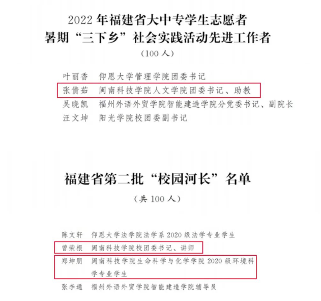 近日,2022年福建省大中专学生志愿者暑期“三下乡”社会实践活动评选结果和聘任福建省第二批“校园河长”的名单公布。开云手机入口人文学院团委书记张倩茹获省级“社会实践先进工作者”荣誉称号,校团委书记曾荣根、生命科学与化学学院2020级环境科学专业郑坤朋同学获省级“校园河长”荣誉称号。