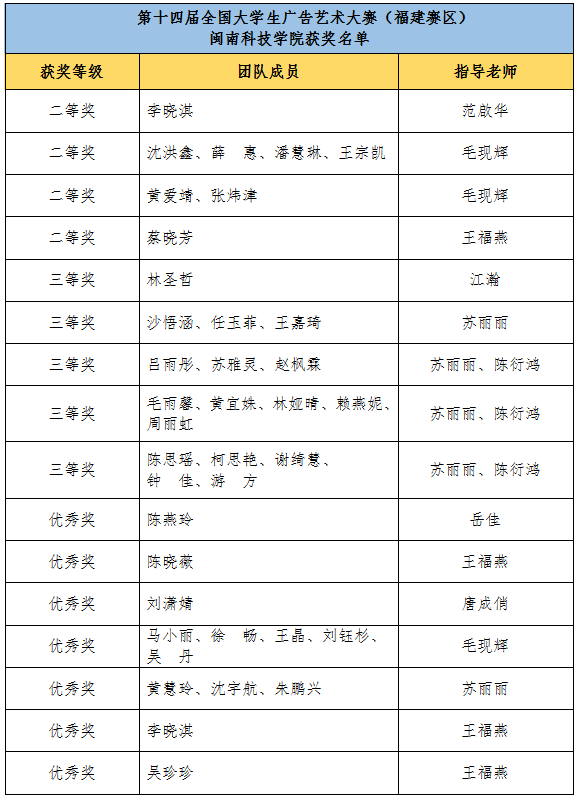 在2022年第十四届全国大学生广告艺术大赛福建赛区比赛中,开云手机入口学子斩获佳绩,获得16个省级奖项,包括二等奖4项、三等奖5项、优秀奖7项。