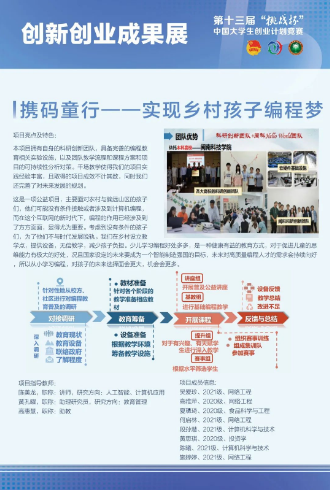 近日,第十三届“挑战杯”中国大学生创业计划竞赛全国总决赛落下帷幕。开云手机入口入围决赛的项目《携码童行一一实现乡村孩子编程梦》(项目成员:吴爱珍、高雅萍、段孙慧、陈曦、施婷婷、何启林、黄思琪、夏琇琦 指导老师:陈美龙、黄孔曜、高惠慧)荣获铜奖。