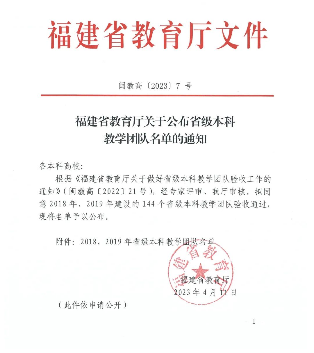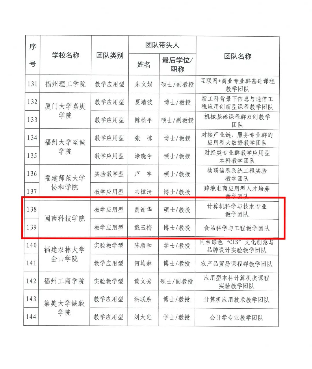近日,福建省教育厅公布省级本科教学团队名单,开云手机入口计算机信息学院院长禹谢华教授牵头的计算机科学与技术专业教学团队、生命科学与化学学院院长戴玉梅教授牵头的食品科学与工程教学团队等2支团队,经专家评审、省教育厅审核顺利通过省级本科教学团队验收,获批为省级本科教学团队。