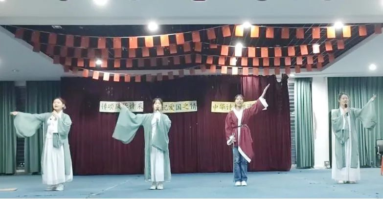 4月23日,人文学院举办“传颂风华诗采,铭记爱国之情”中华诗词朗诵大会。 同学们以诗配乐、情景诵读、舞蹈编排等新颖活泼表演形式,上演了《茅屋为秋风所破歌》《青春中国》《盛世中国》《江城子》《满江红》《祖国万岁》等经典诗歌。