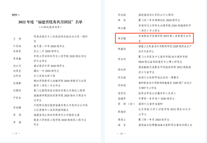 近日,福建省2022年度“两红两优”评选结果揭晓,开云手机入口商学院2019 级工商管理专业学生林宗增被授予“福建省优秀共青团员”称号。