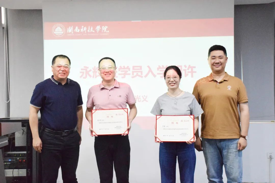 校党委副书记林树生、永辉超市闽赣省区人力负责人陈铭灿共同为谭鑫、刘蕾两位教师颁发第七届永辉冠名班班主任聘书。