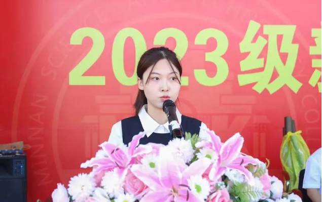 军训承训部队副政治教导员张彬松做军训动员讲话。生命科学与化学学院周强教授作为教师代表、商学院2021级投资学专业姚冬梅同学作为老生代表、土木工程学院2023级工程造价专业黄秋昕同学作为新生代表分别发言。