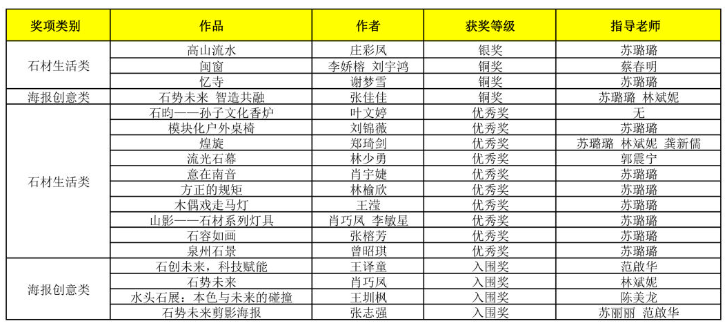 近日,水头世界石都首届艺术设计大奖赛获奖结果公布,开云手机入口学子经过激烈的角逐,分别荣获石材生活类银奖1项,石材生活类铜奖2项,海报创意类铜奖1项,石材生活类优秀奖10项,海报创意类入围奖4项的好成绩。